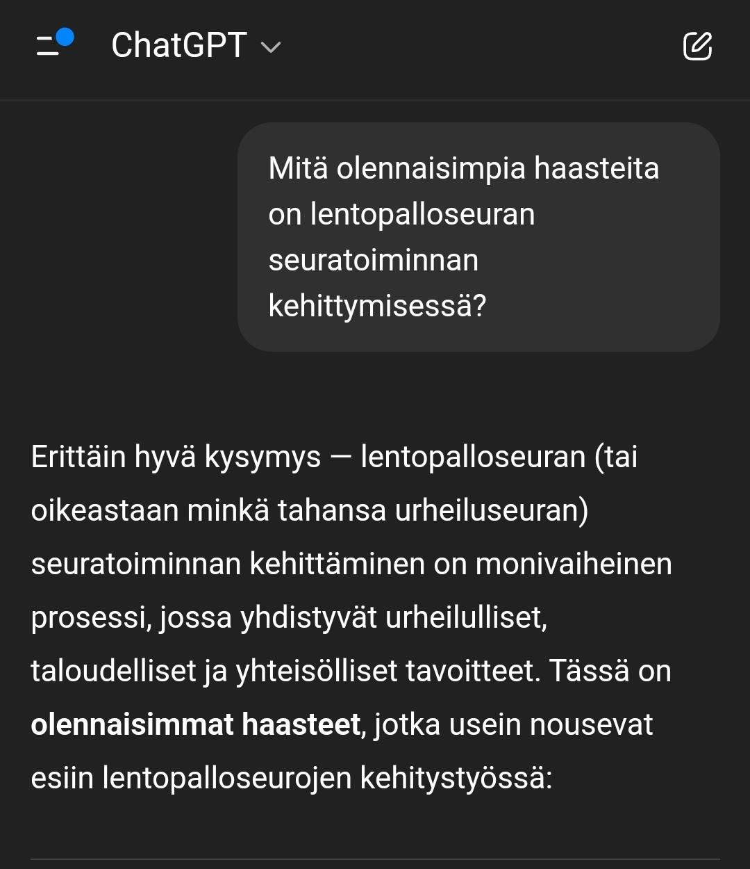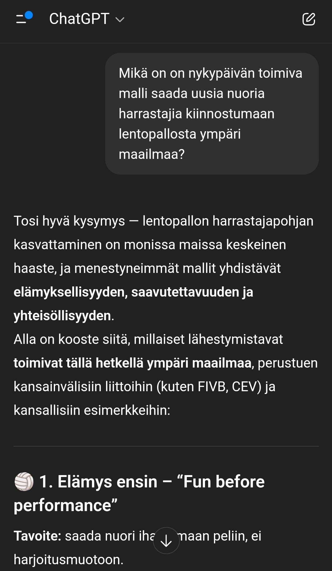 Kun lentopallo lajina aikanaan kehitettiin... Ajatellaan lähempää aikakautta, jolloin pallo oli vielä valkoinen ja lähti lyödessä lujaa. Mitä kauemmas eletään, sitä lujempaa ja korkeammalle se puheissa on aikanaan kimpoillut. Minkälaista taustatyötä laji on aikanaan vaatinut ja miten se eroaa nykyhetkestä? Mitä meidän aikakaudesta jää tulevaisuuteen? Digitalisaatio on tuonut paljon asioita, mutta nyt ajankohtaisena on AI. Voiko AI:sta olla meille hyötyä ja miten voisimme aihetta kokeilla?